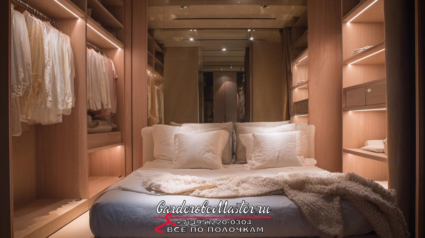 Если хочется уйти дальше, смысла избегать открытости — нет. Гардеробная комната напротив кровати перестаёт быть соперником вашей гармонии, если в основе лежат: