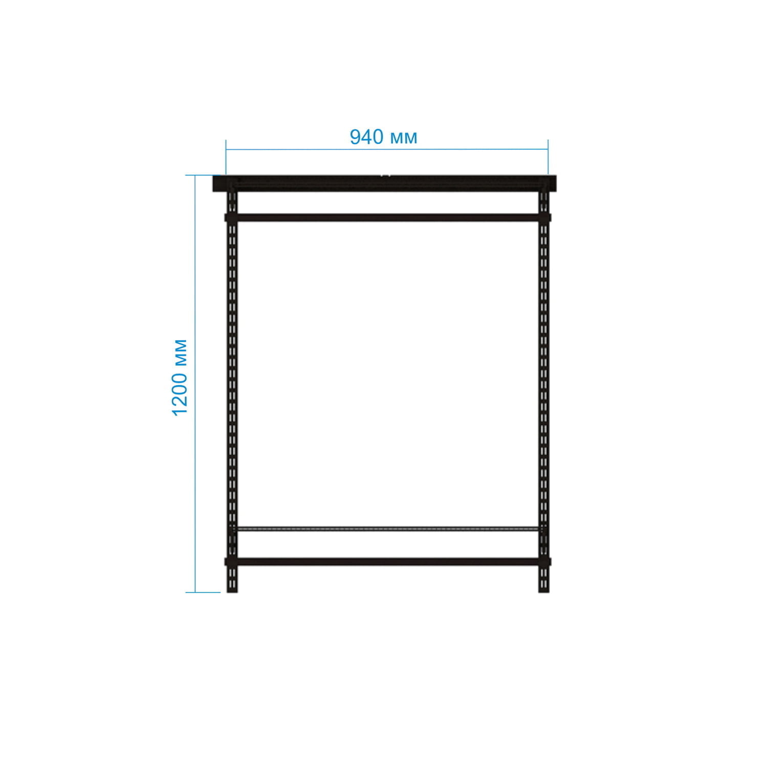 Задней стены как таковой нет, используется стена помещения. Возможно крепление стоек пол/потолок. Так же данный вид конструкции оптимален с точки зрения использования в помещения с наклонными потолками, мансарды, чердачные или подвальные помещения. Стойки имеют приспобления для крепления их к потолку под произвольным углом наклона. Полки так же могут крепиться под произвольным углом наклона поверхности (используются специальные крепления).