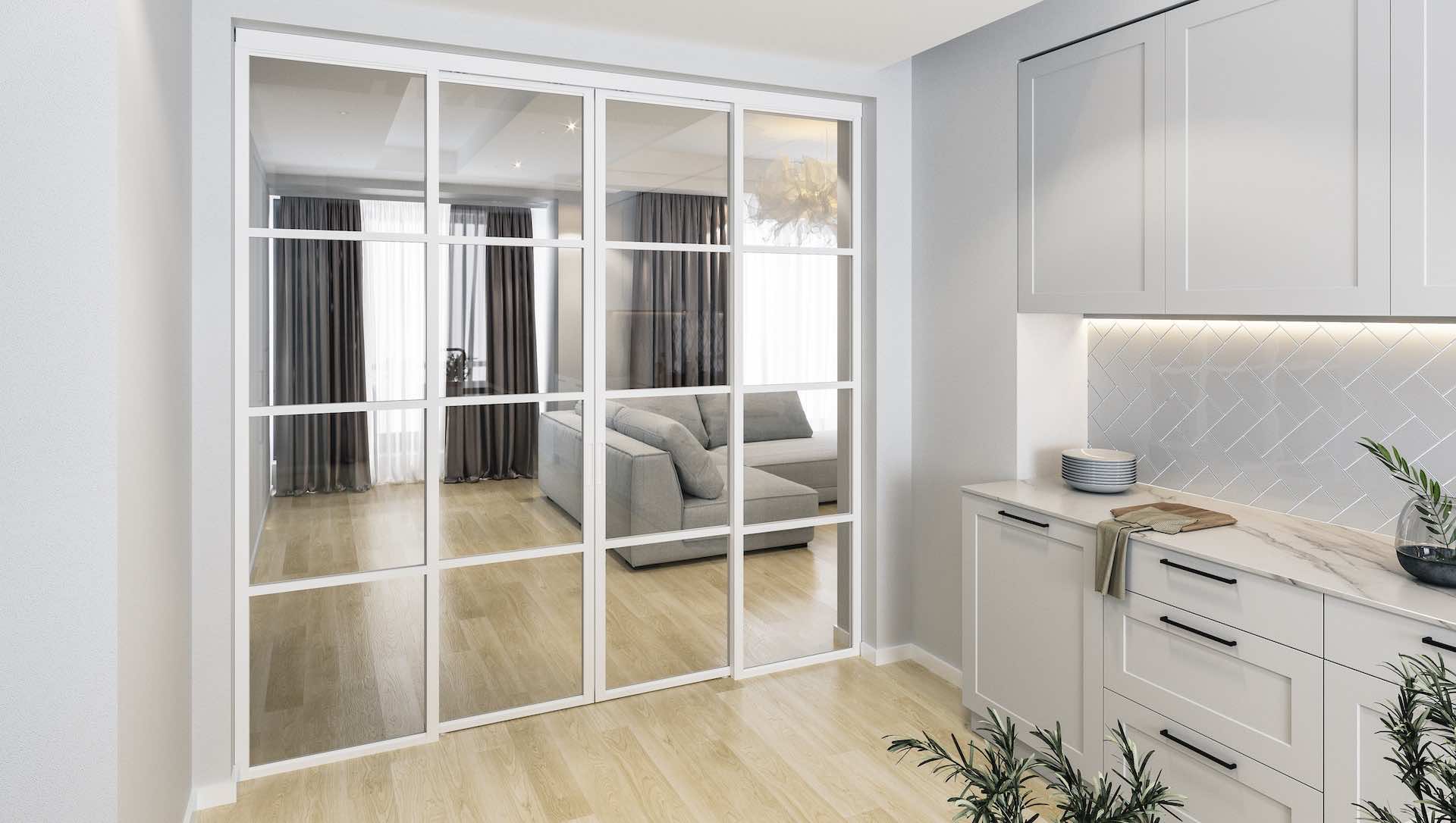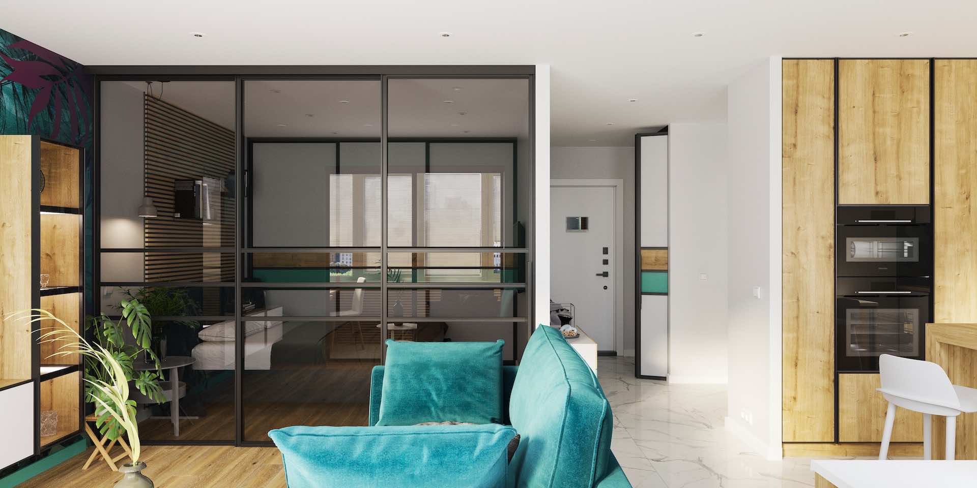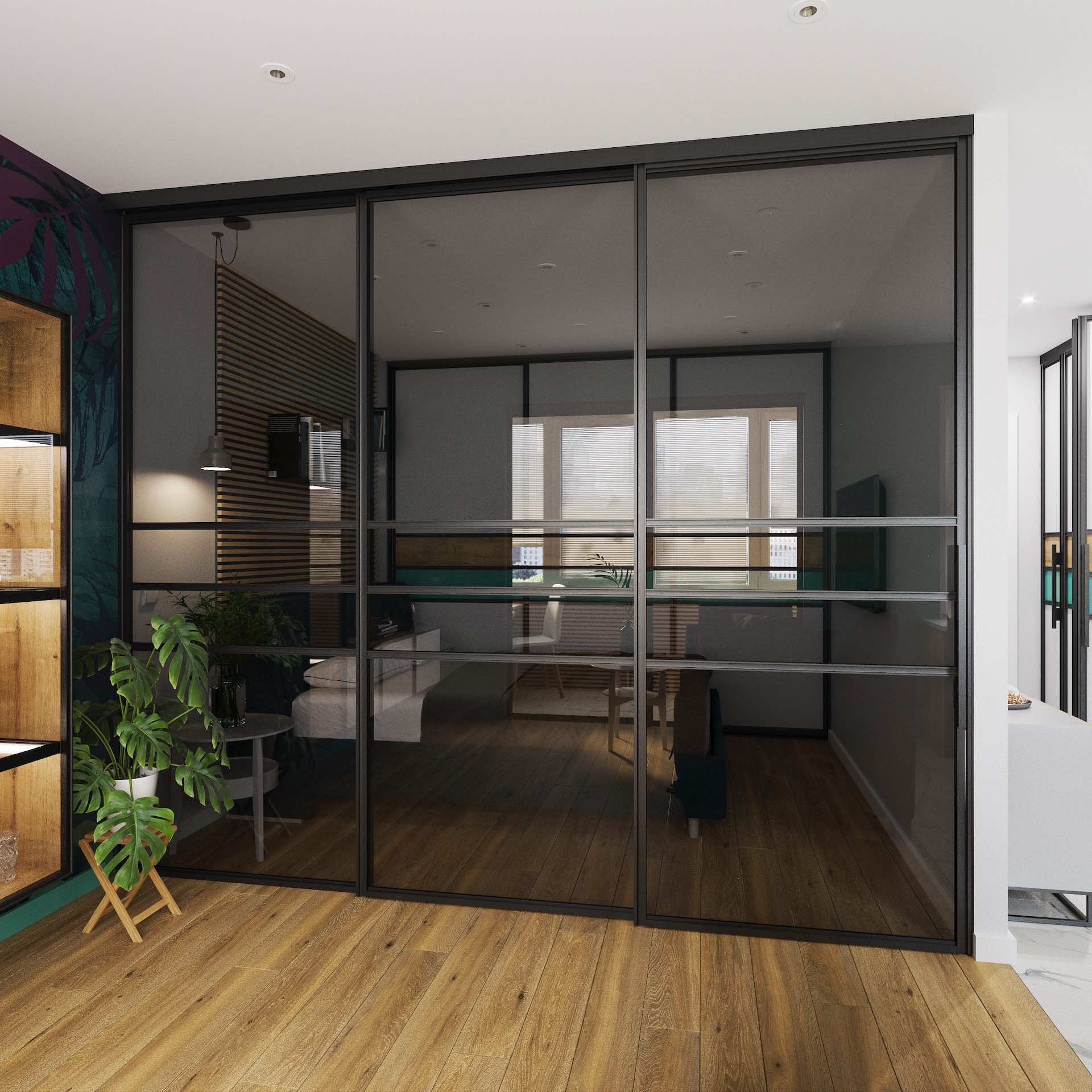 Перегородки используются для отделения гардеробных комнат, спален, кабинетов, кухонь-гостиных, а также в качестве альтернативы классическим межкомнатным дверям.