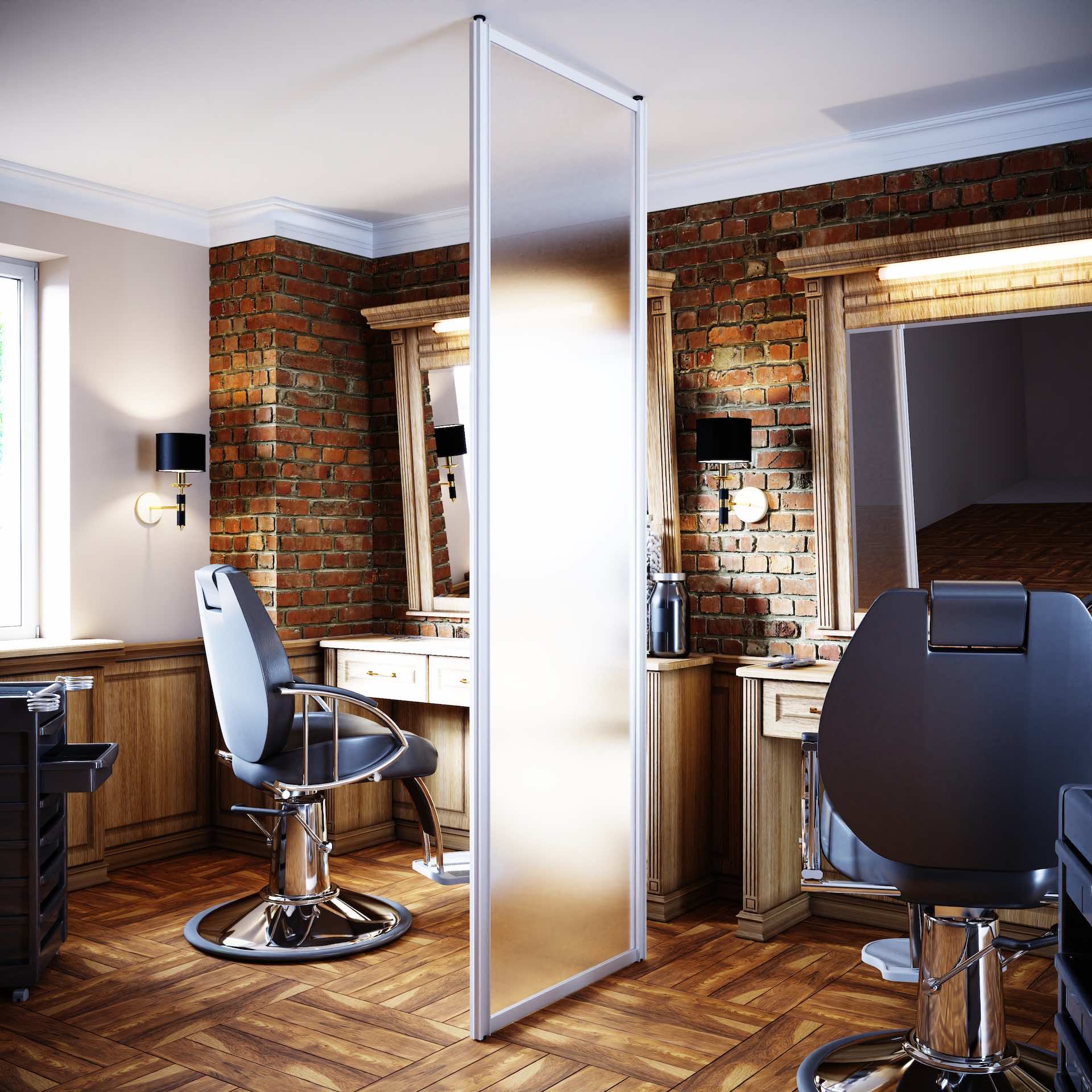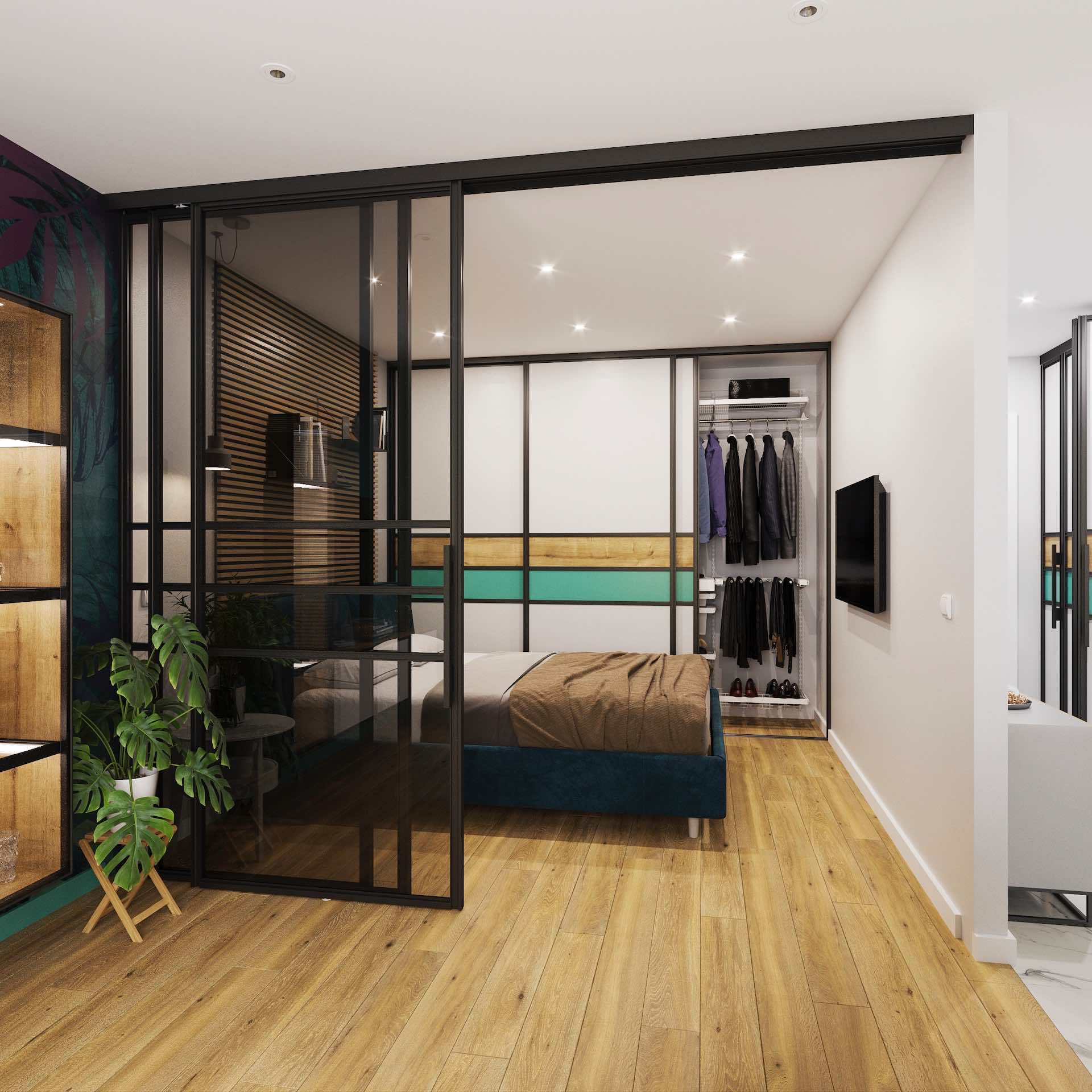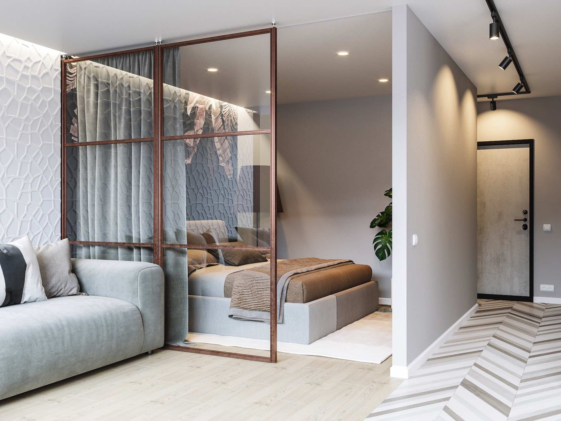 Перегородки используются для отделения гардеробных комнат, спален, кабинетов, кухонь-гостиных, а также в качестве альтернативы классическим межкомнатным дверям.