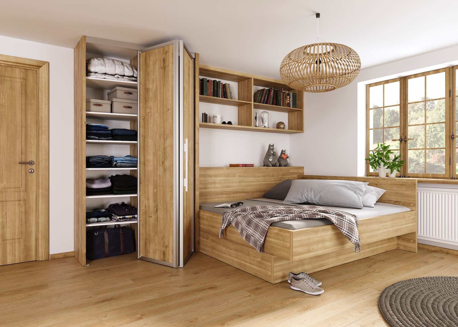 Для широких проёмов применяются решения с синхронным движением створок, при котором элементы перемещаются согласованно и предсказуемо. Это особенно удобно для проходных зон и гардеробных комнат.
