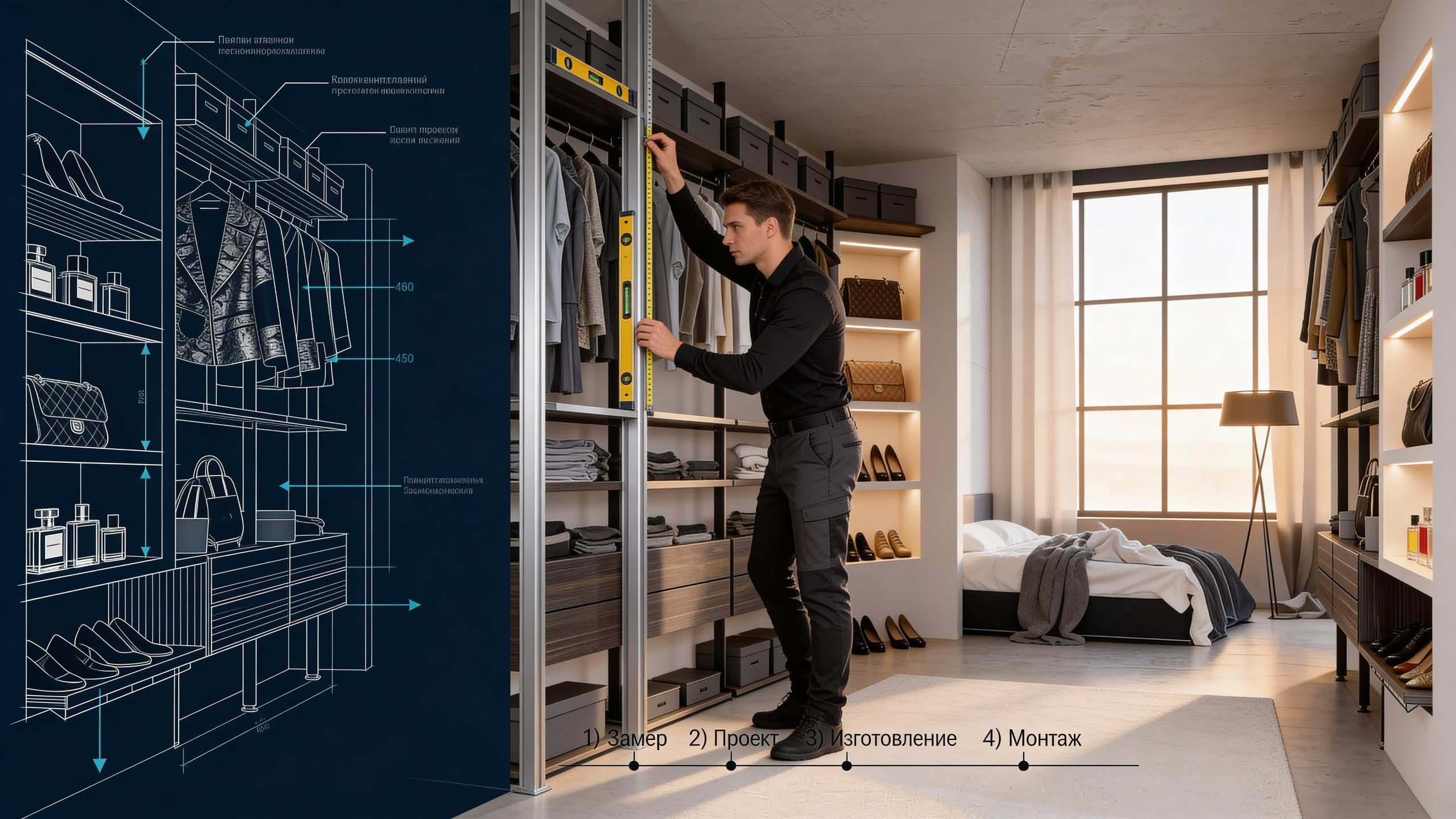 Промо‑видео с готовым интерьером после монтажа и акцентом на сервис: «выезд мастера». В кадре мастер делает замеры в коридоре/у проёма, демонстрируя этапы замера, консультации и подбора материалов перед изготовлением гардеробной или шкафа на заказ.